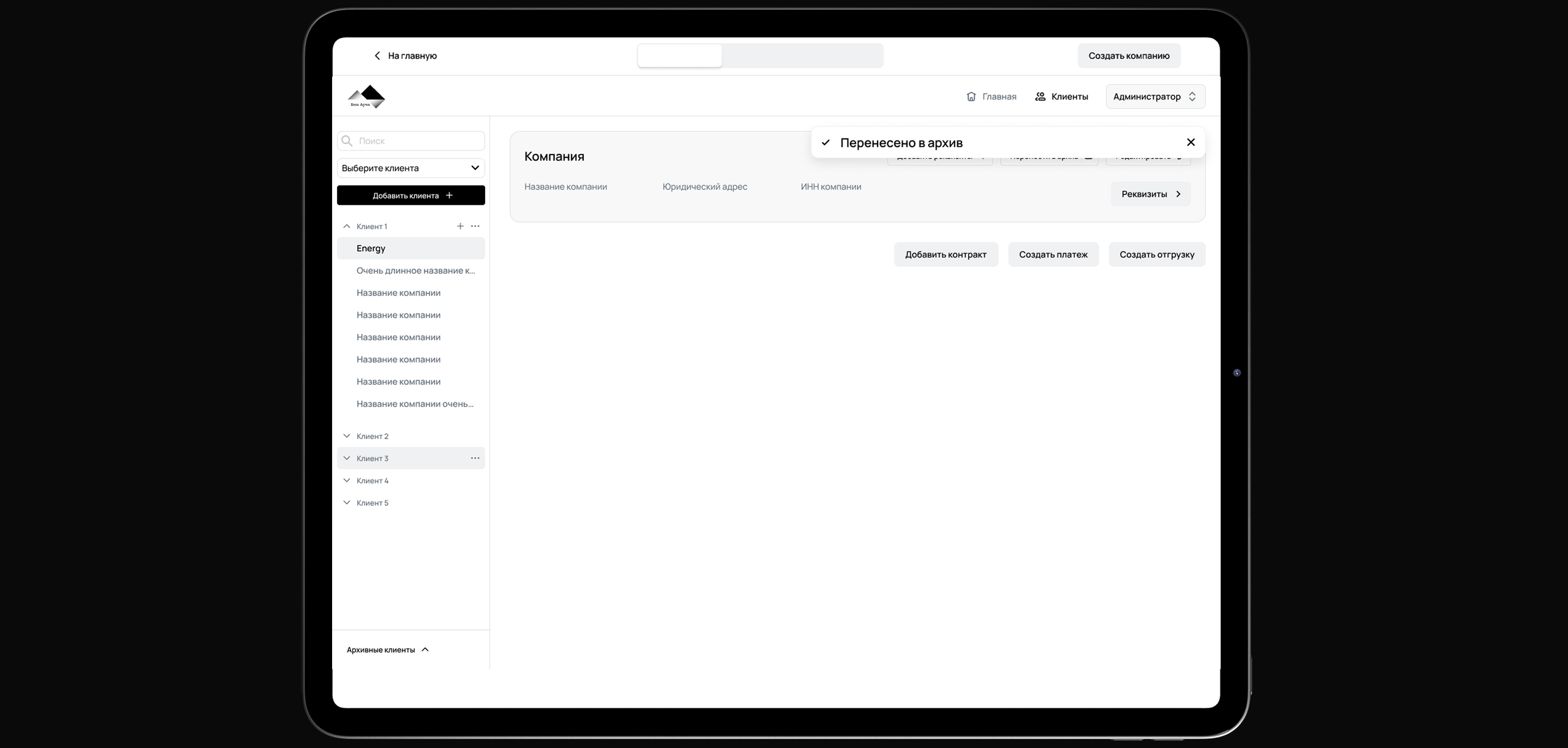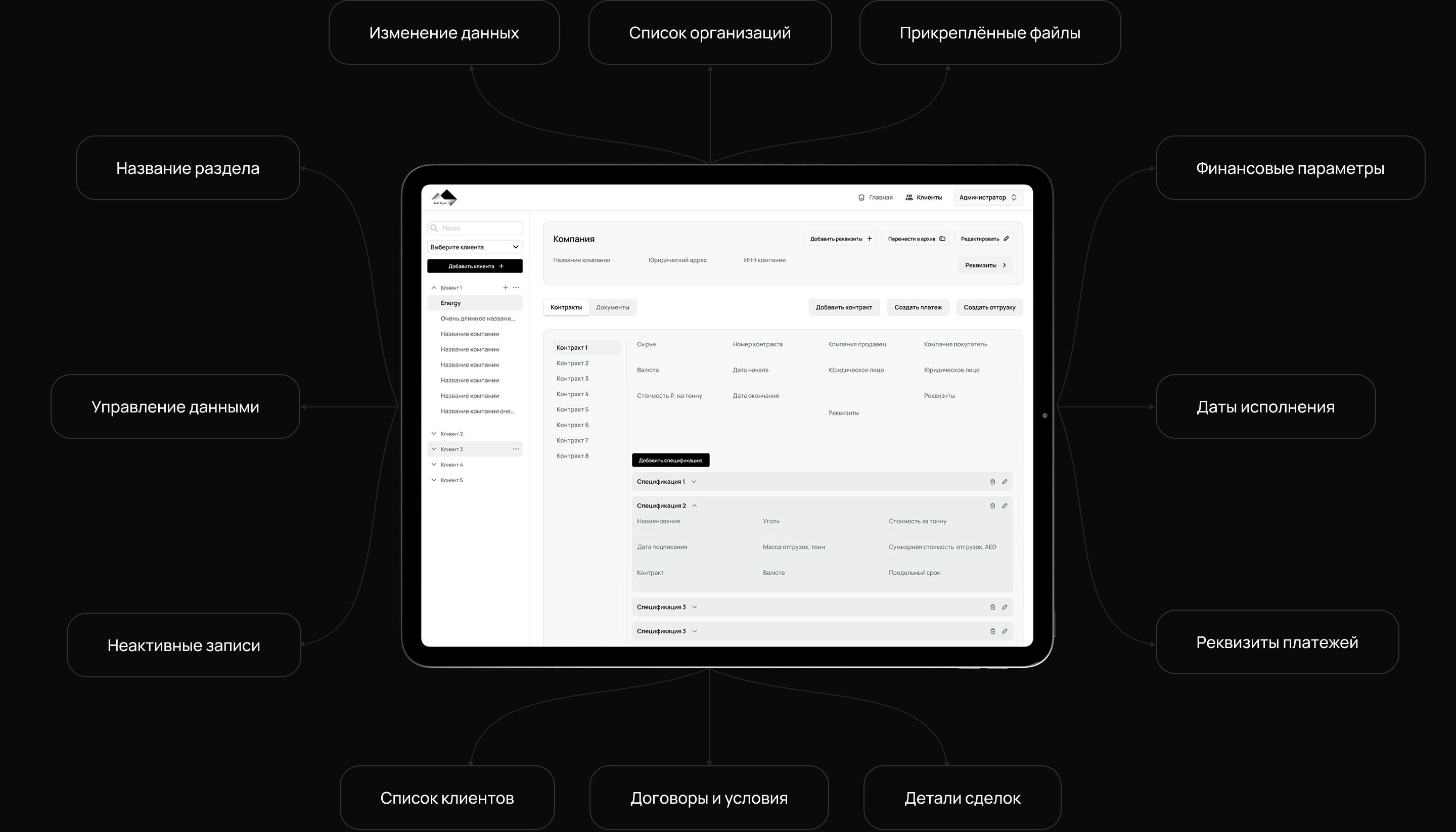 Предоставил полный контроль над бизнес-процессами. Здесь администраторы управляют юридическими лицами, редактируют информацию о товарах, управляют сотрудниками, клиентами и балансом. Фиксируют поступление оплаты, создают и редактируют контракты и отгрузки, загружают и хранят необходимые документы