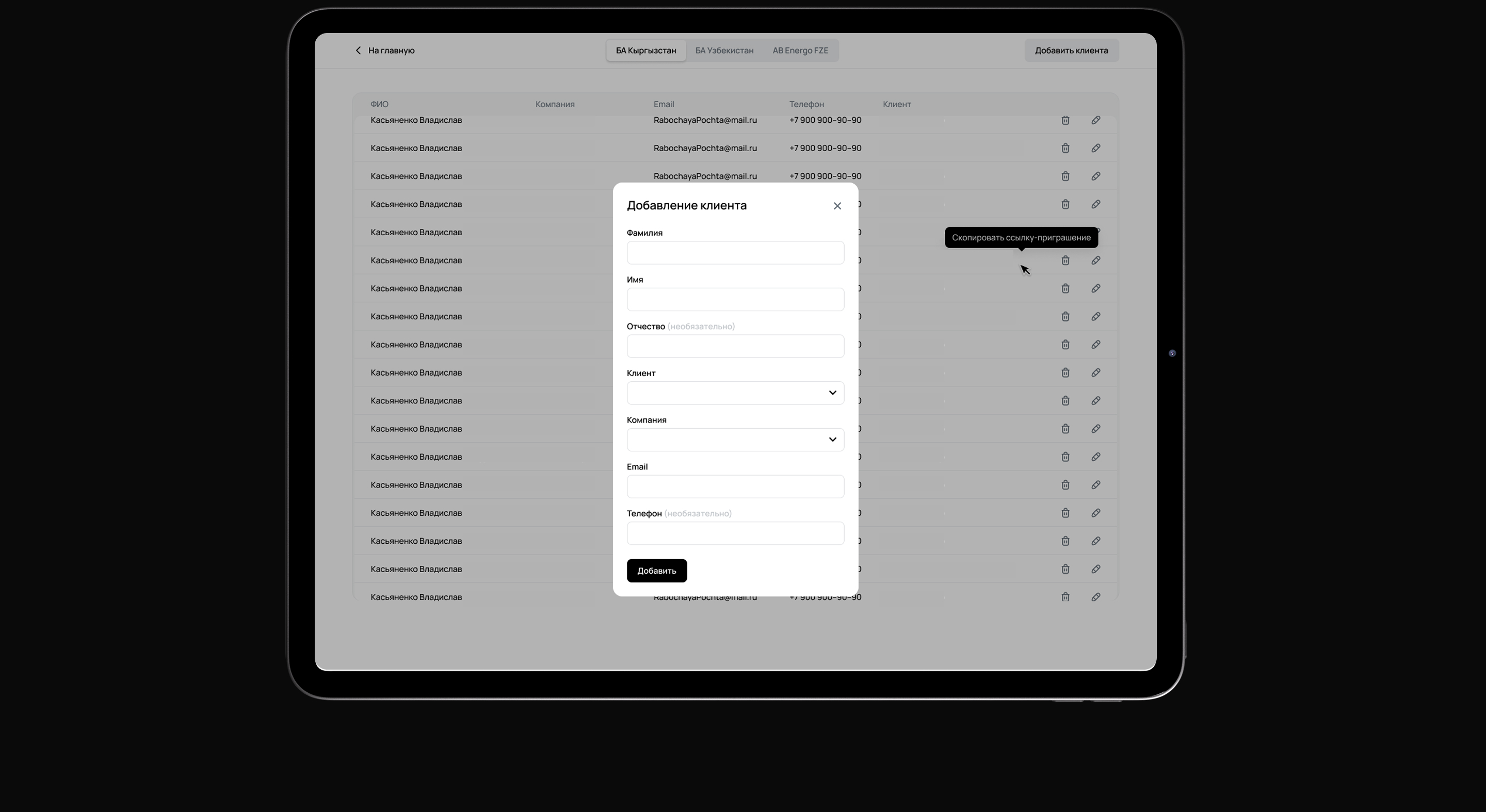 У менеджера функционал тот же, что и у администратора, но без управления сотрудниками. Менеджеры видят только компании и клиентов, закреплённых за ними.