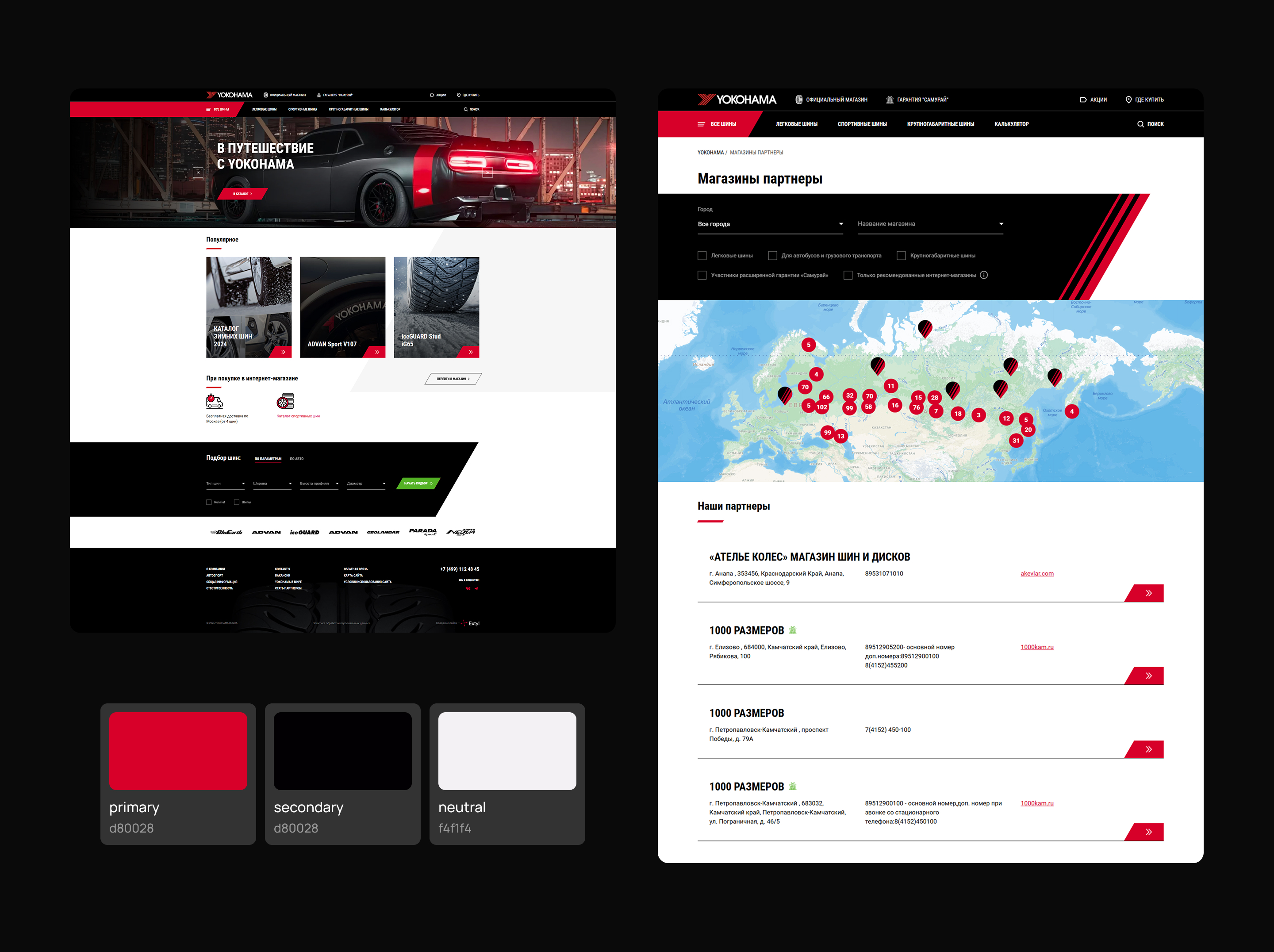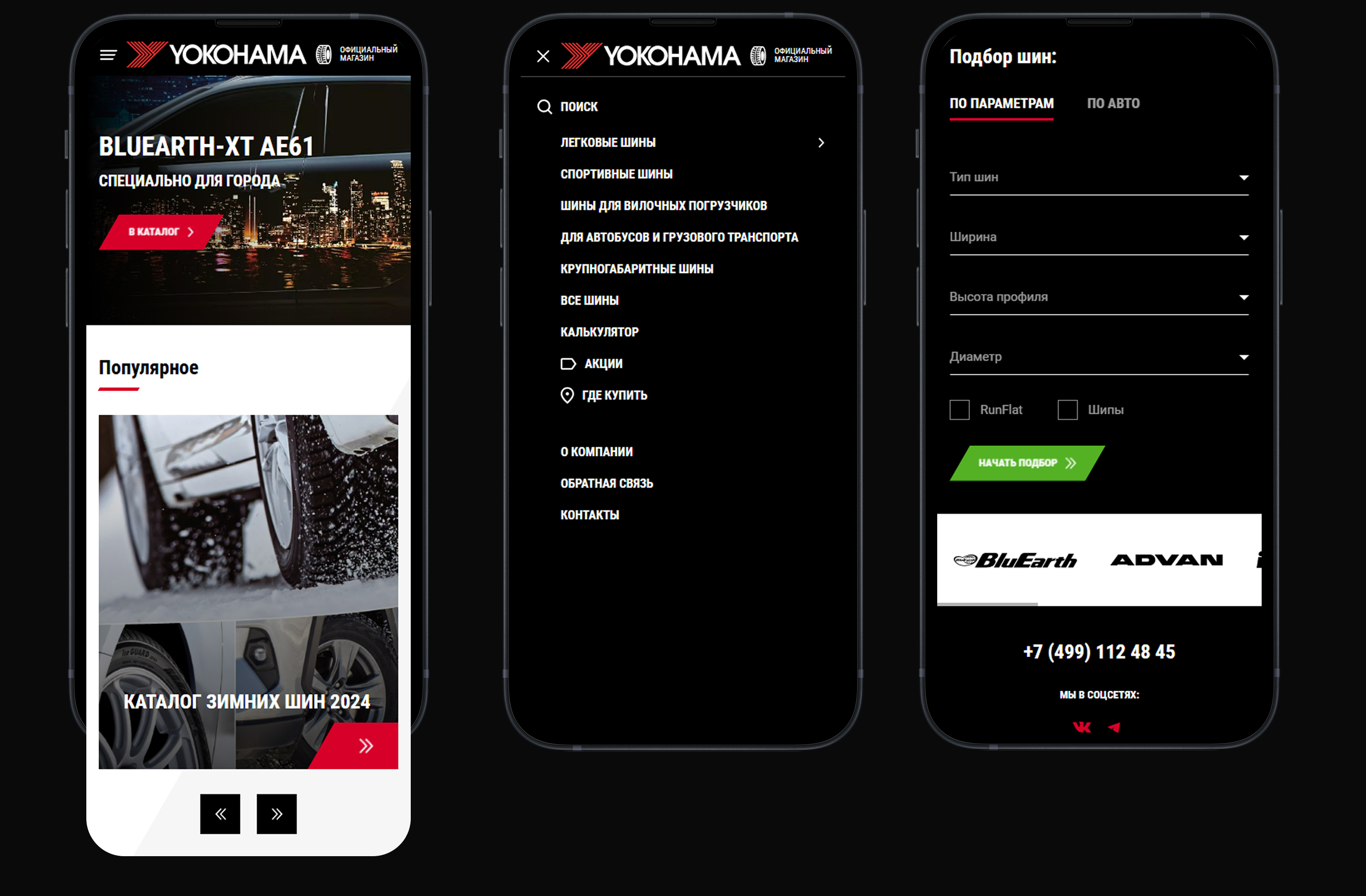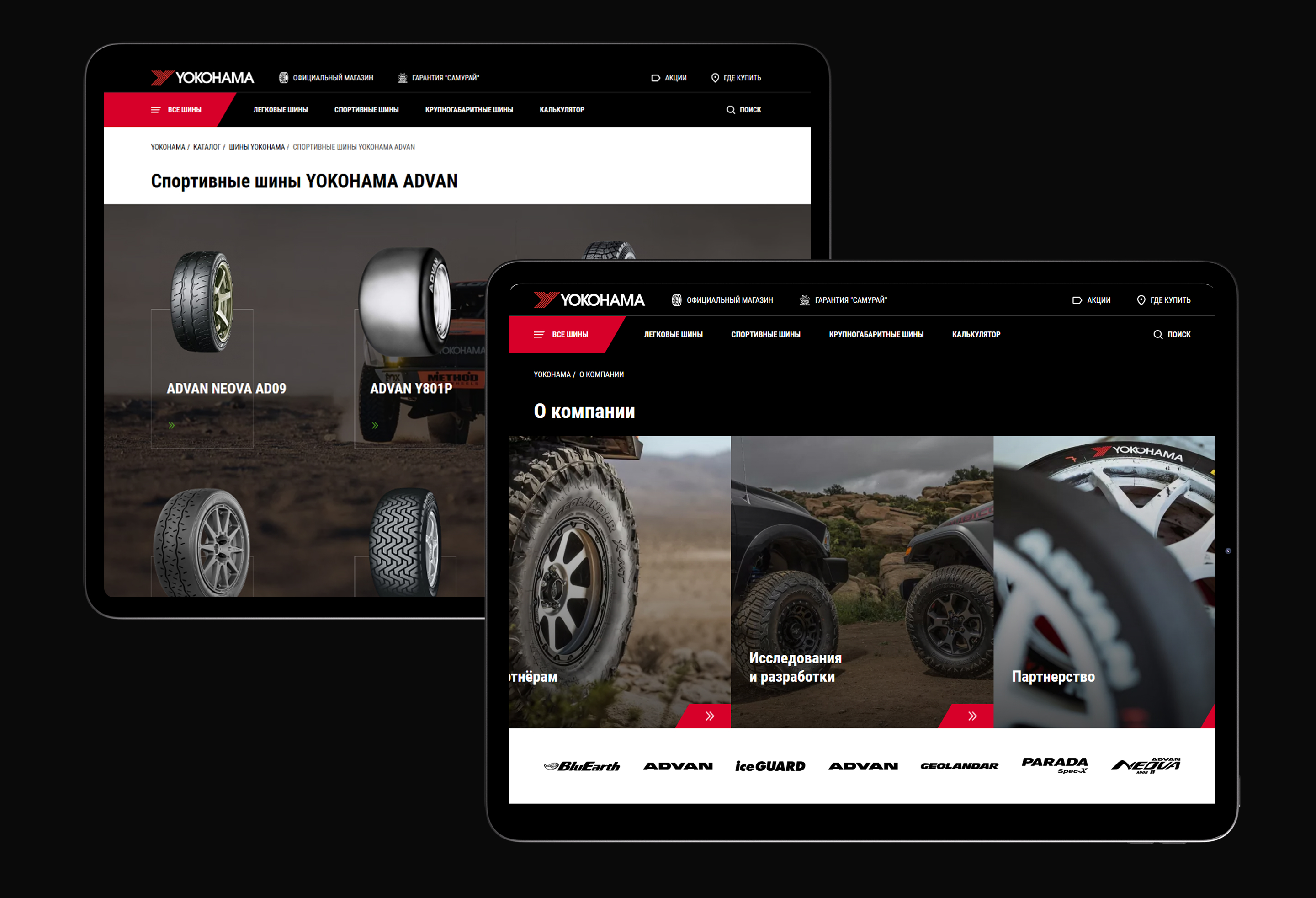 Разработали дизайн-концепцию в фирменном стиле YOKOHAMA. Создали интерактивные прототипы страниц, которые демонстрируют структуру, навигацию и пользовательский интерфейс. Провели юзабилити-тестирование с участием представителей целевой аудитории, чтобы выявить и устранить потенциальные проблемы. Также разработали адаптивный дизайн, который обеспечивает правильное отображение на всех устройствах: компьютерах, планшетах и смартфонах